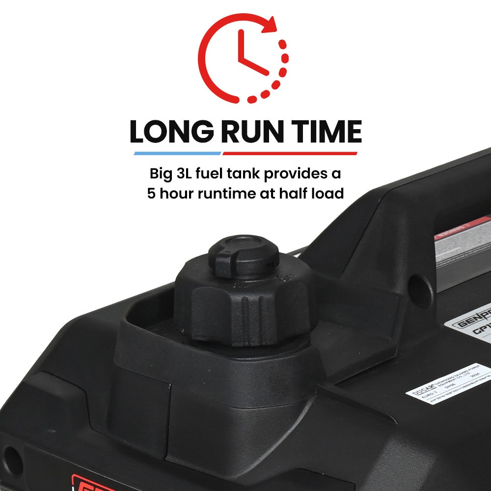 - Runtime:6.5 hr (25% load), 5 hr (50% load), 3.4 hr (100% load)