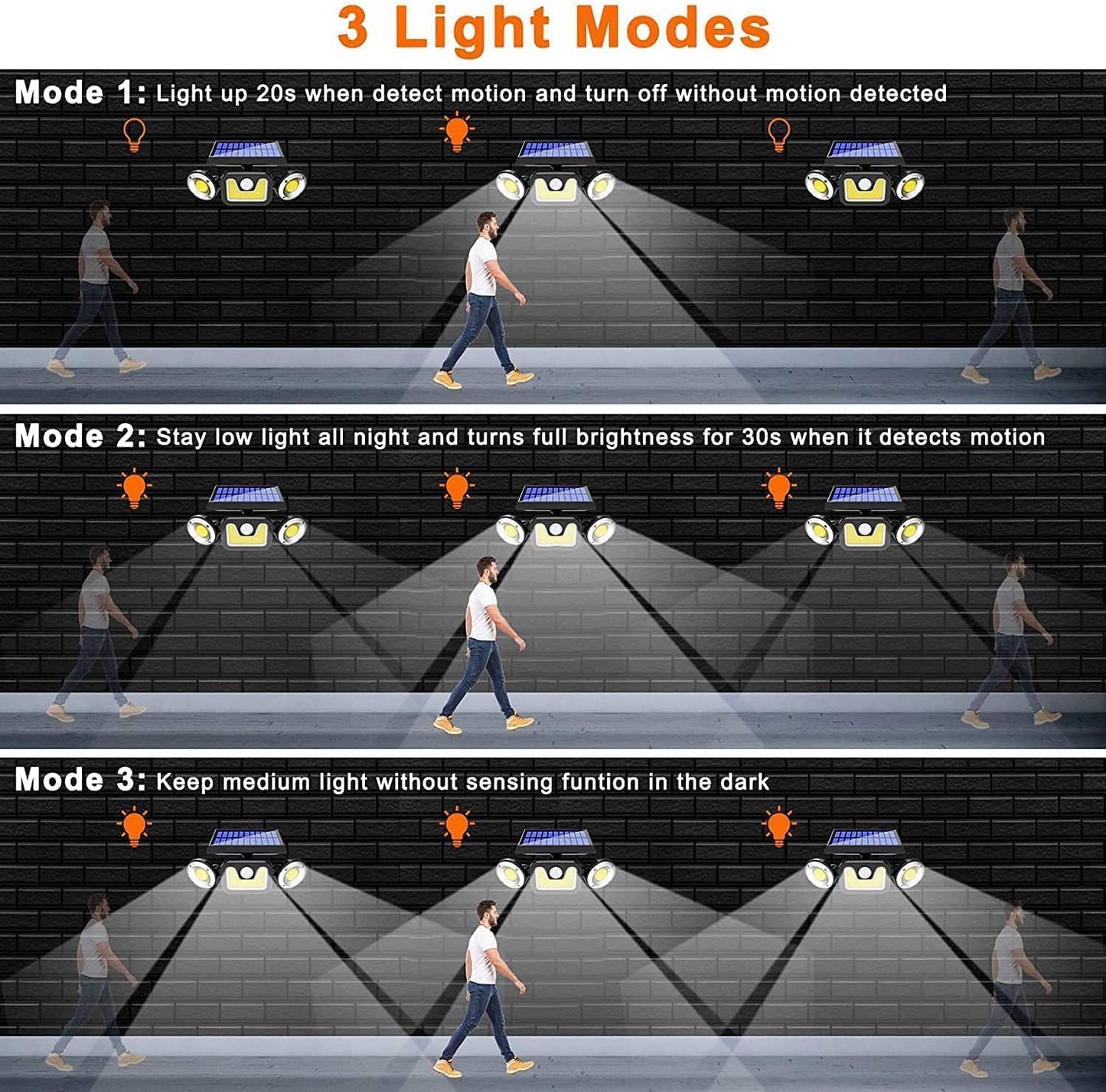 - Solar Light with Wide Lighting Area: Solar light outdoor with the wide-angle and three head design. The part of the solar light can be adjusted to 360° angle. And the lights on both sides can be adjusted 120° left and right and rotated 360° up and down. So you can freely change the irradiation direction as you like, and save your trouble to install two extra lights. No need for electricity, environment-friendly product.